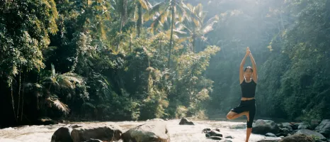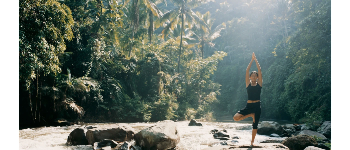 Woman in black active wear standing in a yoga pose in the jungle, with sun rays peering through the tree canopy