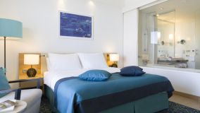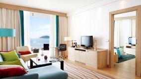 Modern hotel bedroom with white walls and bedding, blue soft furnishings, a desk with a TV and a furnished balcony with a sea view