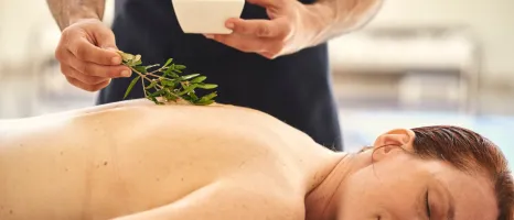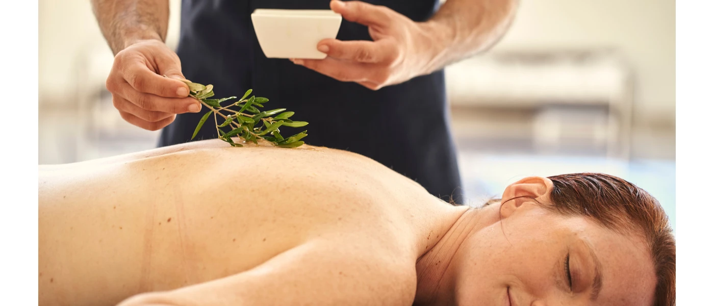 Smiling woman with eyes closed lies on her front, as a therapist caresses her back with a shrub