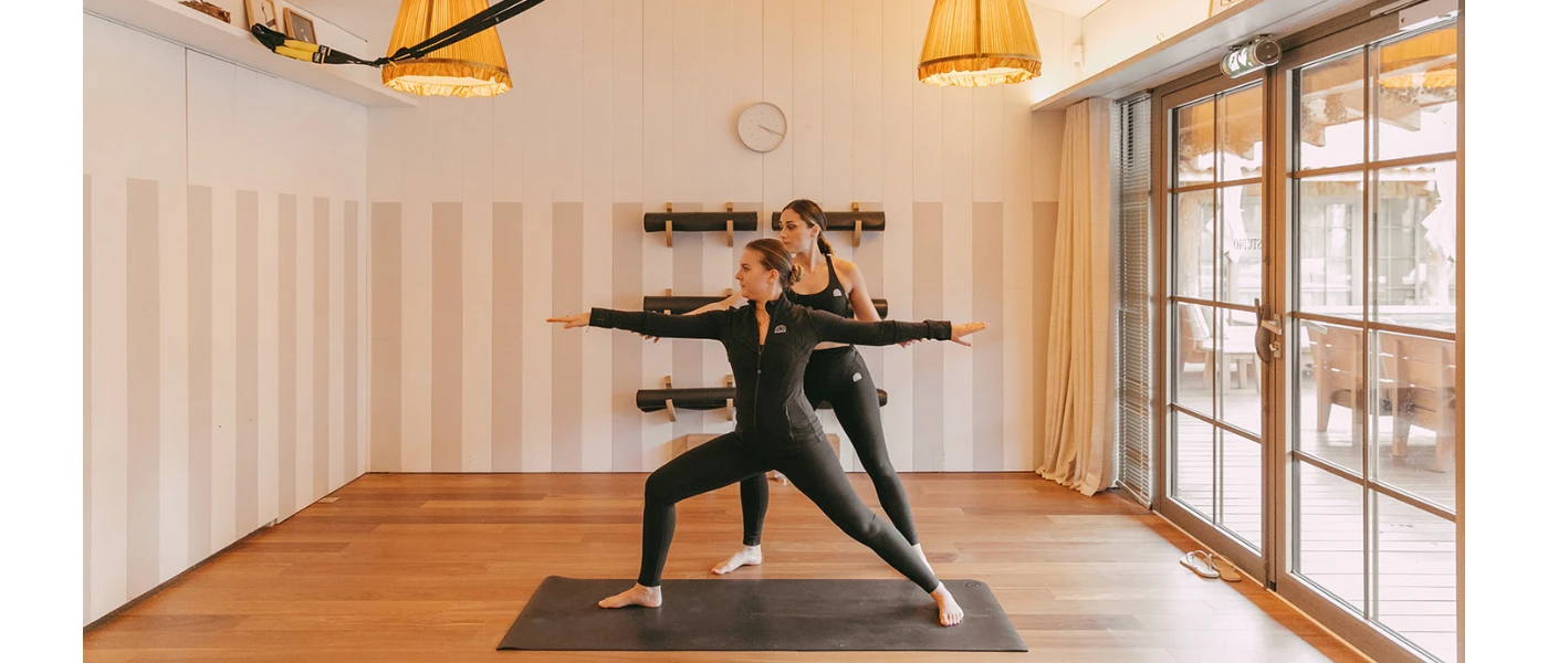 A woman in warrior pose on a mat in a bright studio, with an instructor watching on behind