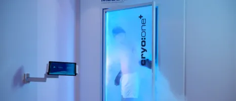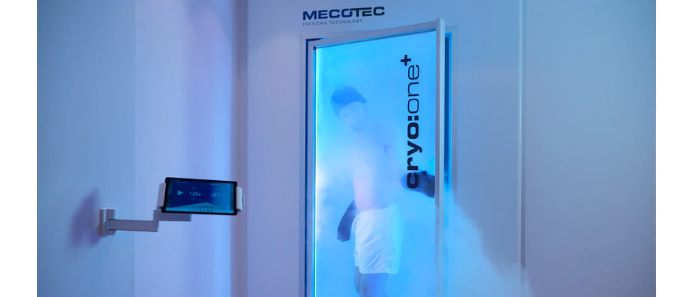 Man in white shorts in a blue-lit cryotherapy chamber