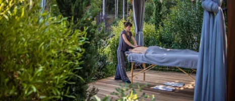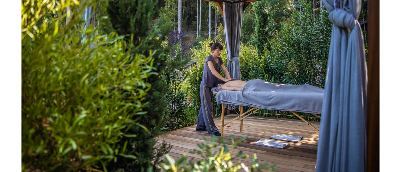 Woman lies partially covered by a blue towel on a massage bed in an open-air cabana surrounded by a forest, as a therapist massages her back