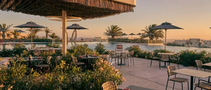 NOŪS Santorini has 129 rooms, bungalows and suites – some with private pools. Most rooms accommodate two guests, with the Pool Bungalow and Junior Suite sleeping up to three, the Pool Suite up to four, and the Two-Bedroom Pool Suite up to five.