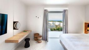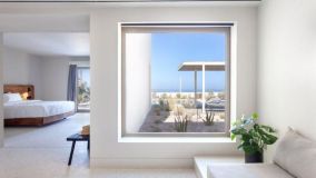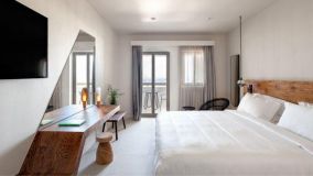 All rooms are bright and airy with a modern, minimalist aesthetic. The architecture blends contemporary style with Cycladic influences, incorporating natural materials and textures that reflect the island.