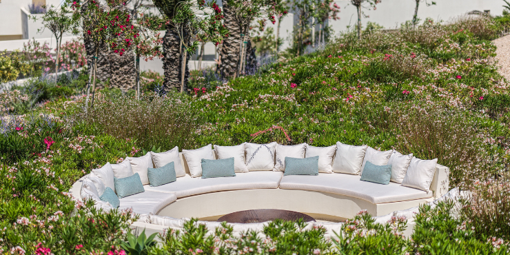 At the heart of the hotel is a lake-like pool – the largest on the island, in fact, which comes with a side helping of smart cushioned loungers. Elsewhere among the landscaped grounds you’ll find NOŪS Spa, a futuristic looking space for soothing treatments and expert-led Pilates, with a wedge-shaped indoor-outdoor pool.
