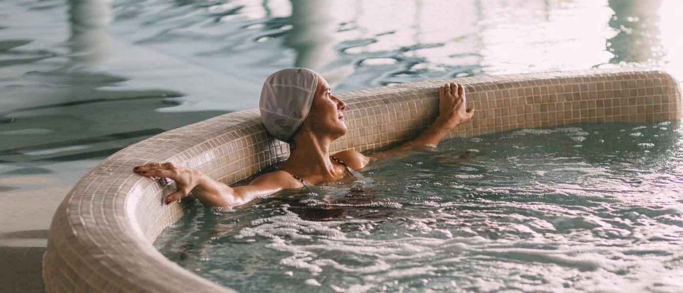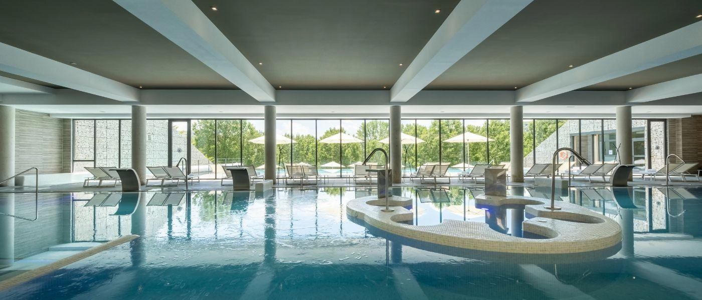 The spa’s hydrothermal complex includes two mineral-medicinal thermal pools – indoor (heated) and outdoor, along with 16 treatment rooms, Jacuzzis, bubble seats, and a variety of water jets, both above and below the surface. A dedicated relaxation area, fully equipped gym, and poolside terrace round things off. Water temperature is maintained at a toasty 32 to 34°C, too.