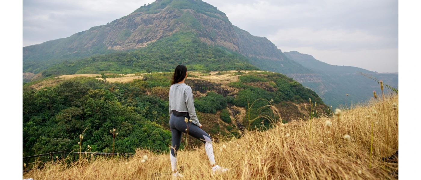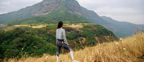 Woman stands on a hillside in active wear, gazing out towards forested peaks