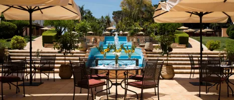Outdoor terrace overlooking a turquoise fountain with cream sofas with blue cushions, and a table laid with cocktails and snack platters
