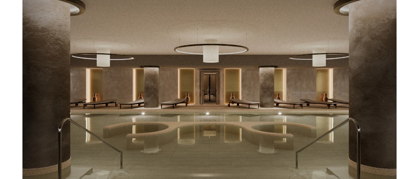 Chic indoor pool area with grey marble-like walls and pillars, contemporary pendant lights, and LED lighting with vases lined along the back wall