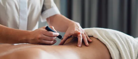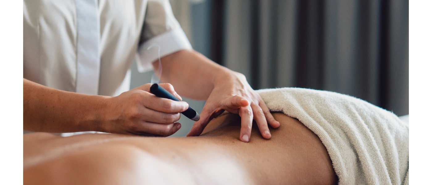 Guest lies on their front as a therapist holds a thick stick with smoke coming out of it over their back