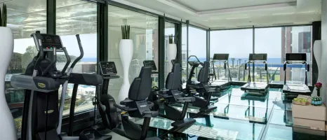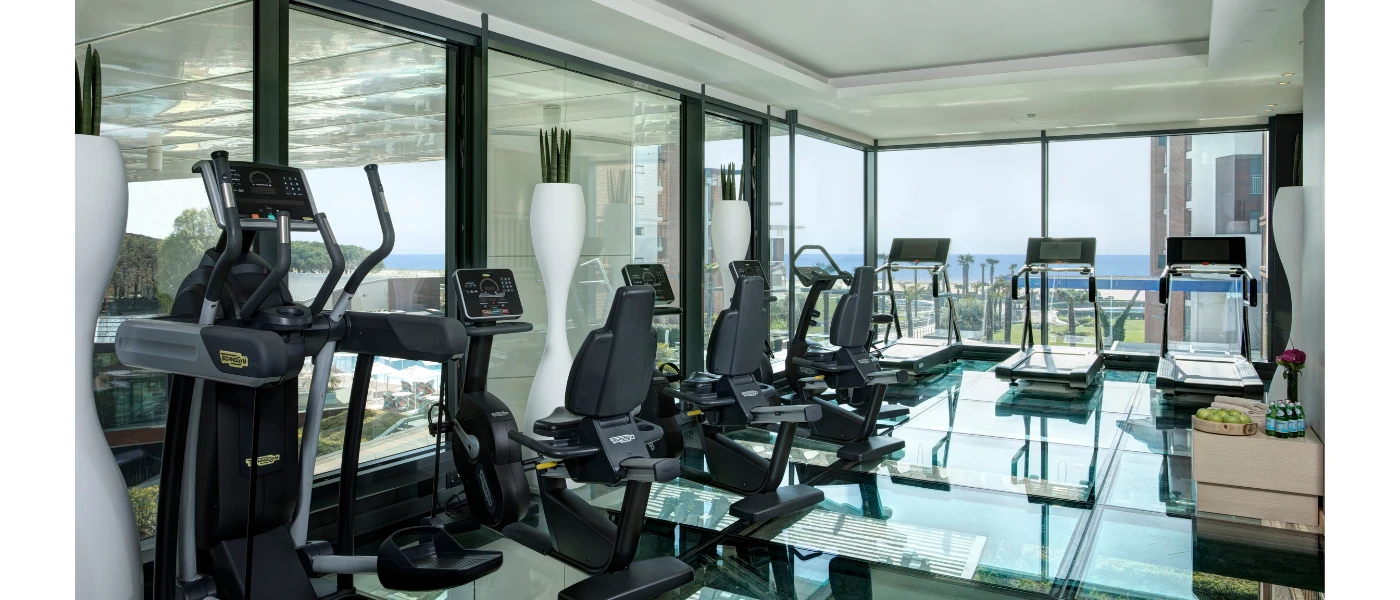 Modern gym with wraparound windows and black treadmills, bikes and cycling machines, plus a glossy floor