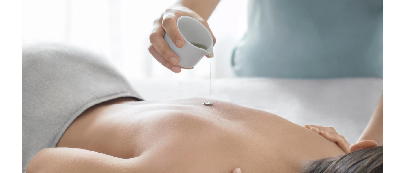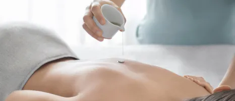 Woman lying down as a therapist pours liquid out of a small white jug onto the skin of her back