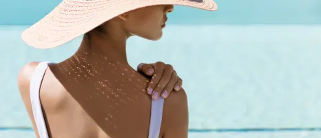 Woman lying down as a therapist pours liquid out of a small white jug onto the skin of her back