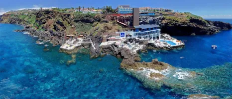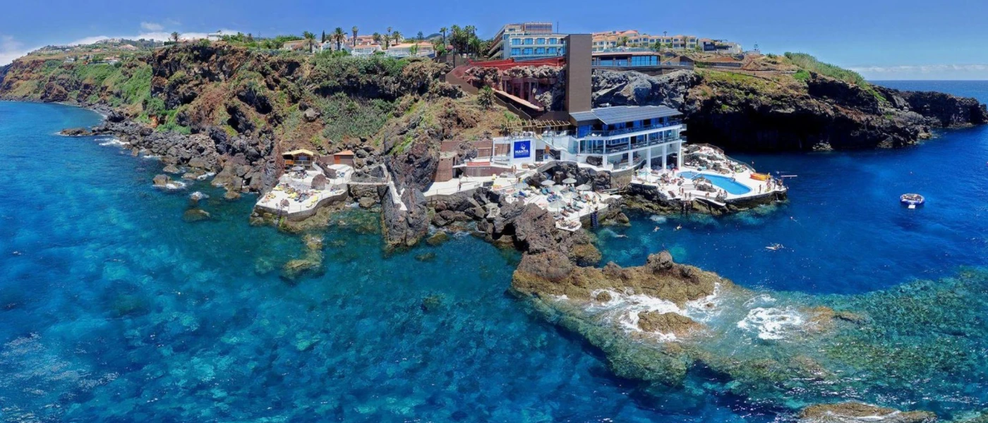 Aerial view of Sentido Galomar swimming pool, lido sunbathing terrace and hotel buildings