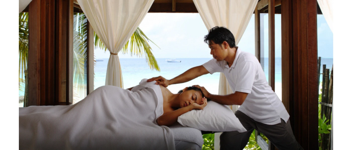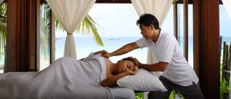 Two people enjoy a massage on neighbouring beds in an open-sided cabana with a view of the ocean