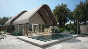 Two thatched-roof villas with sleek wooden decking and walls, with swimming pools and steps direct to the sea