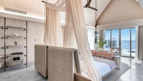Bohemian-style villa interior, with a neutral colour scheme, blue feature wall, a potted plant, bed and sofa area