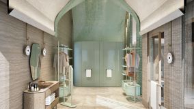 Wellness area with neutral walls, soft lighting, shell sculptures, a vanity unit and a wooden table with towels folded on it