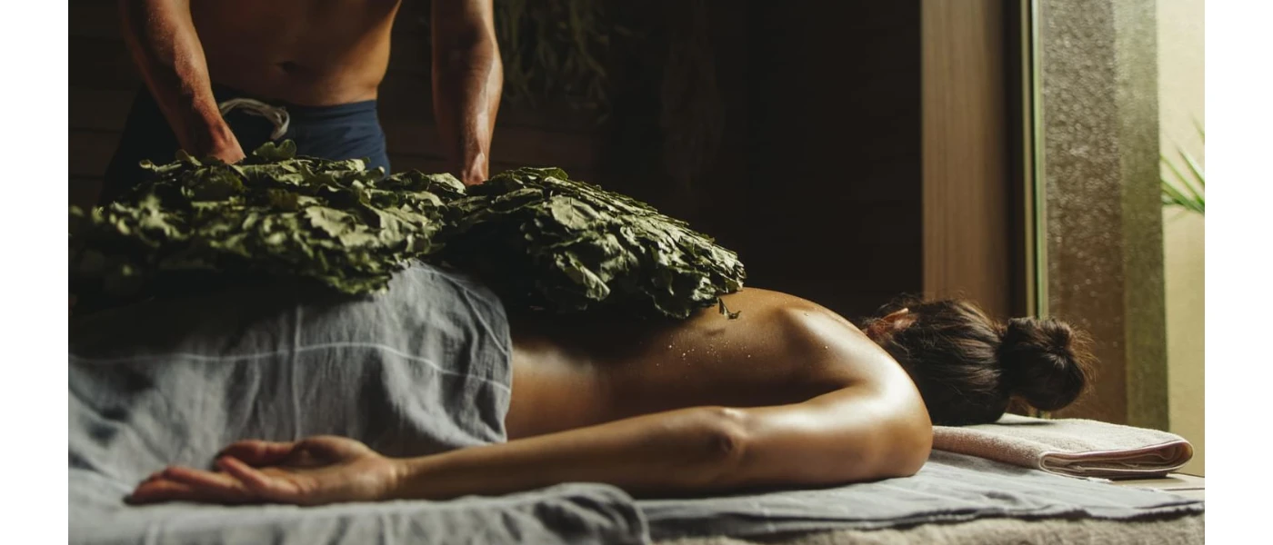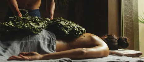 Woman lying on her front on a treatment bed as a therapist works on her using large leaf-like looking items