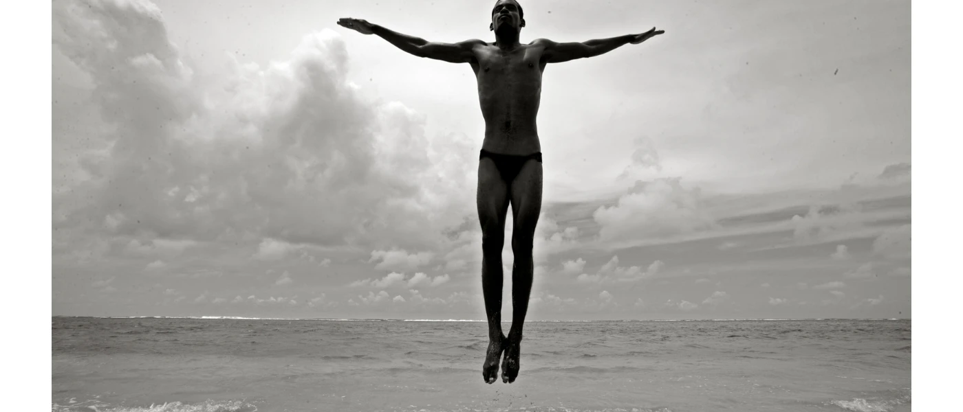 A man and woman with knees bent and arms outstretched next to a water feature overlooking the ocean