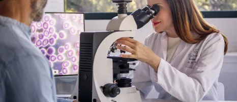 Health professional in a white coat gestures to a screen with readings on vascular health, vital signs and muscle strength, as a sitting woman looks on