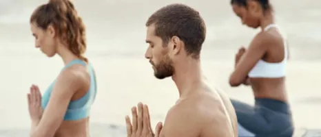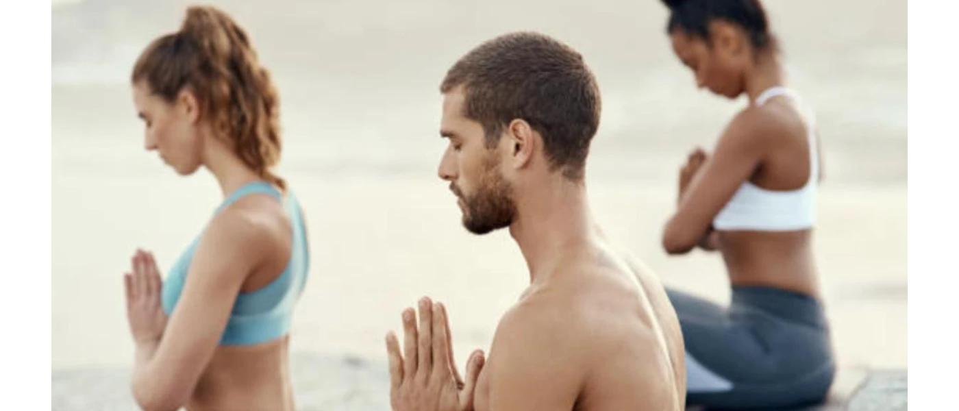 Three people in active wear sitting in lotus position with their hands in prayer position