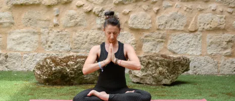 Woman sitting with her legs crossed and hands clasped in prayer wearing black active wear on a pink yoga mat in a stone-walled courtyard