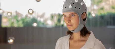 Therapist applies a head mask to a man's head, with wires coming out the bit