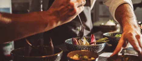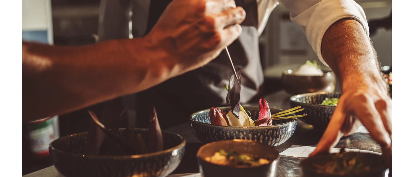 Chef in a dark apron leans over bowls of vegetables