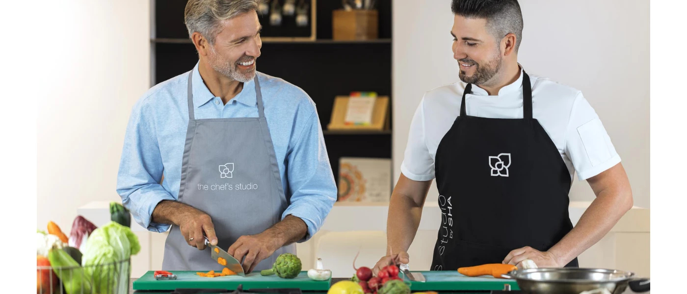 Two smiling men in aprons chop vegetables in a workshop as part of a cooking class