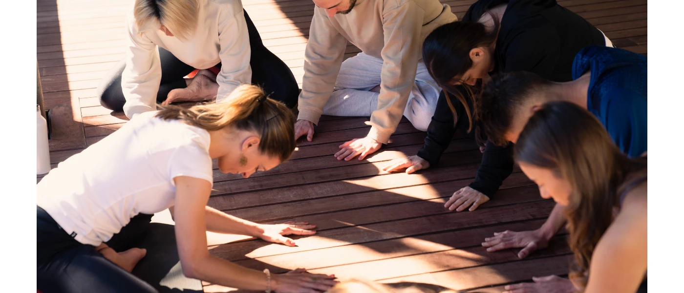Group in comfy clothes sit in a circle on a wooden deck, with a person in the centre and their heads bowed