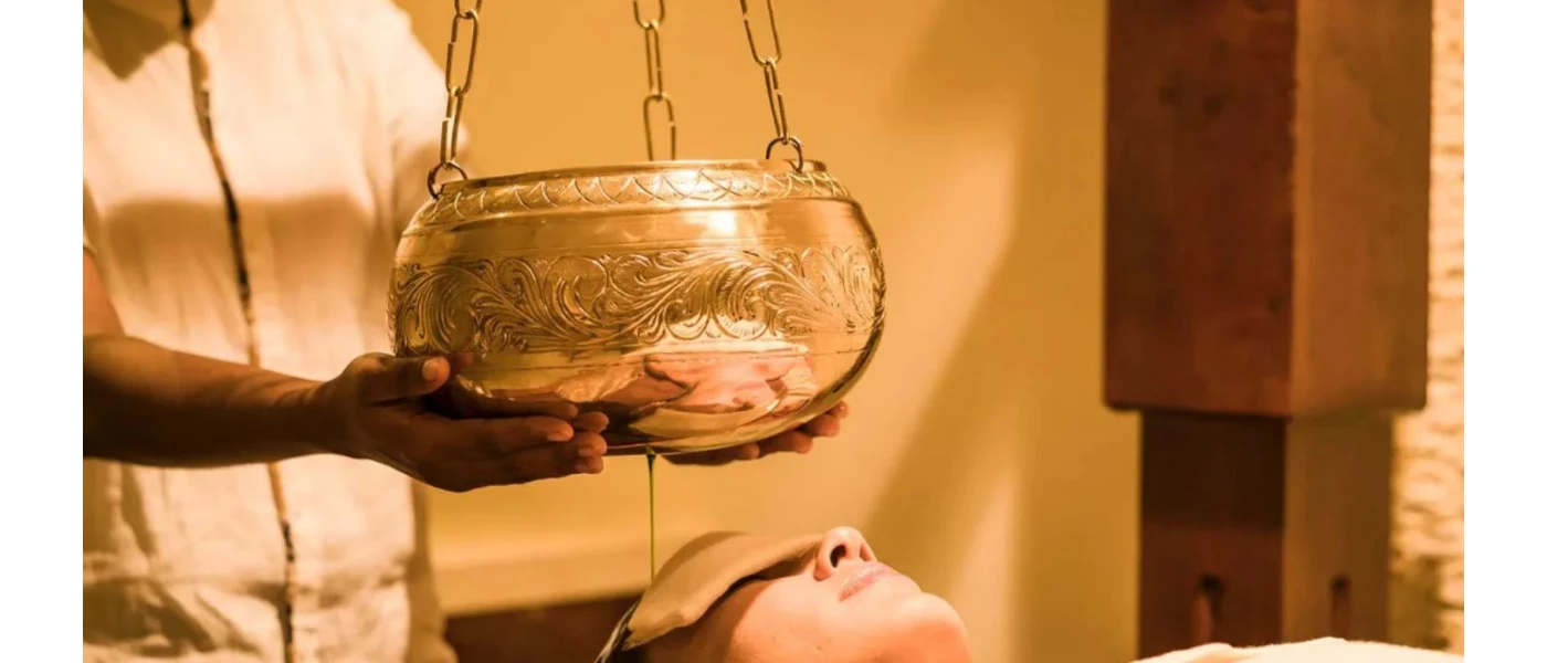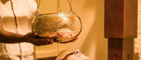 Woman lying down with an eye mask on as a therapist pours oil over her head from a golden bowl