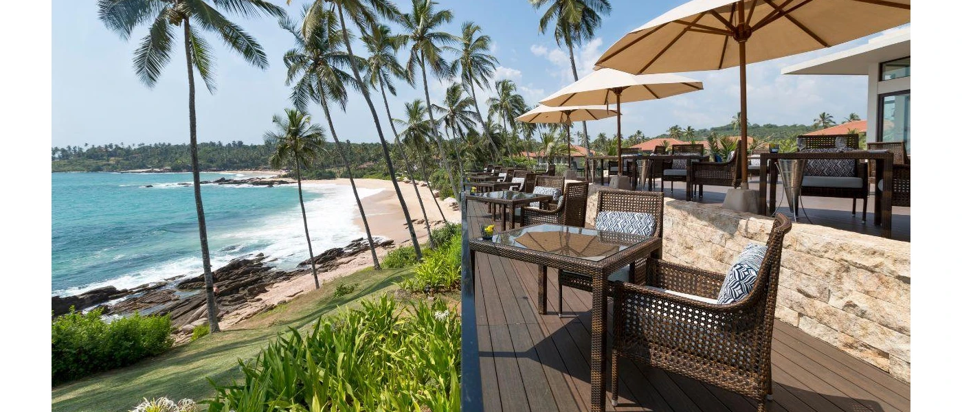 Wooden terrace furnished with tables and chairs and umbrellas overlooking sloping palm trees and a sandy beach