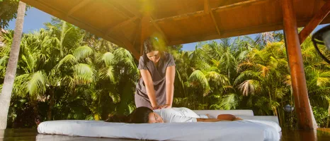 Woman enjoys a massage on a white mattress in an open-air cabana surrounded by tropical greenery