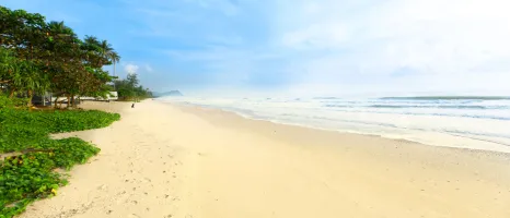 Nadan Beach, with its white sands, clear blue shallows and tropical greenery back