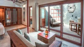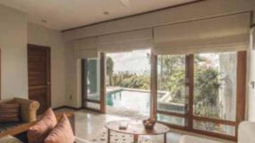 Villa with a tiled roof and private deck with a pool, shrouded by tropical plants