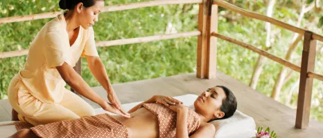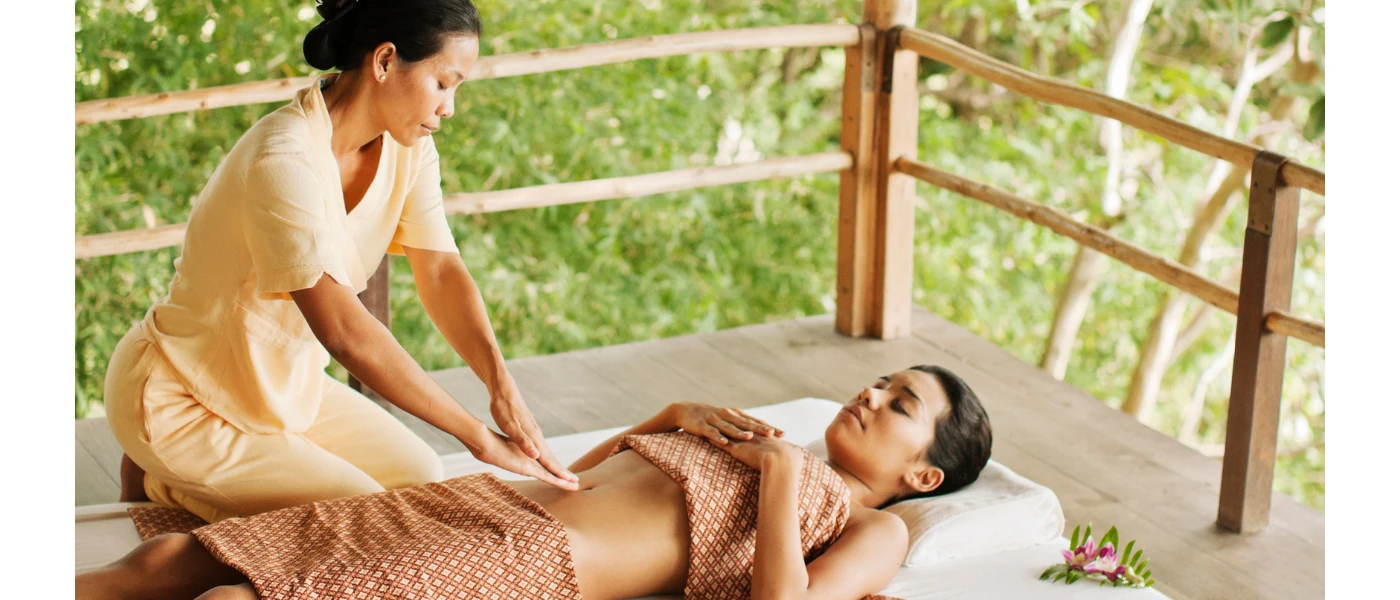 Woman in white with a pink flower in her ear enjoys a Thai massage in an open-sided cabana surrounded by tropical gardens