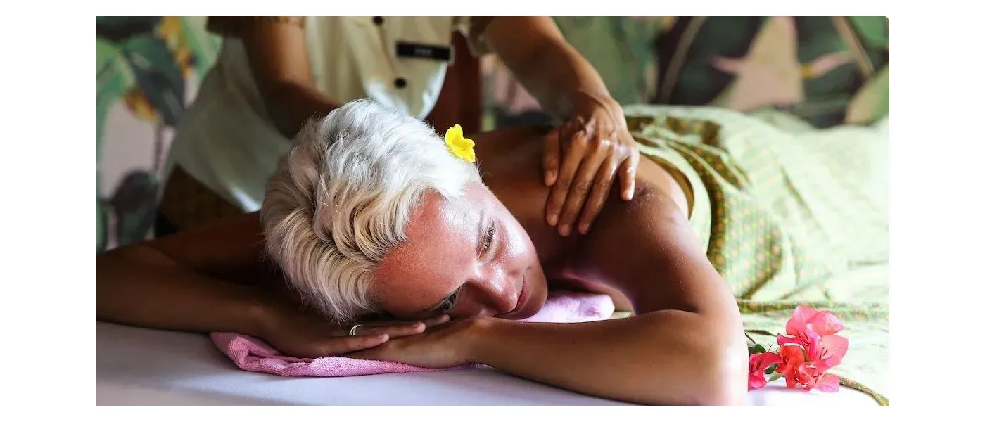 Woman lies on her back with a yellow flower in her hair, relaxing as a therapist massages her back